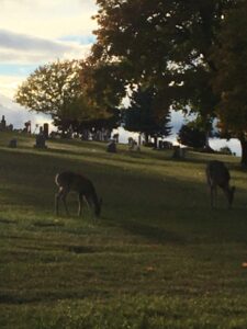 Deer graze at future gravesites at Conrad Cemetery, Kalispell, Montana