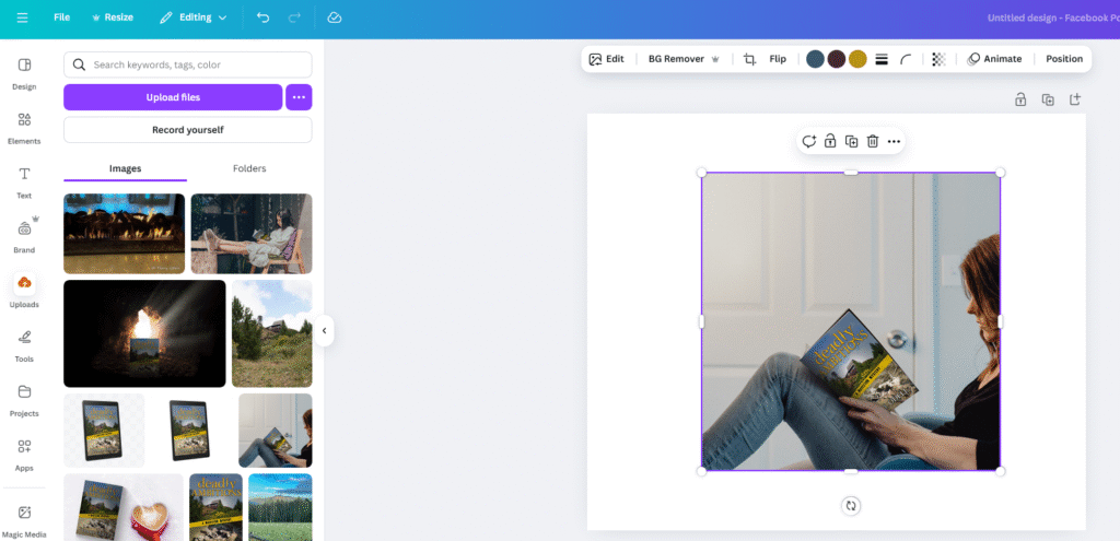 Next, I take the mockups, and any images of my own I might want to use, and upload them to Canva. From here, it’s a lot of playing around with all the options and tools they offer.