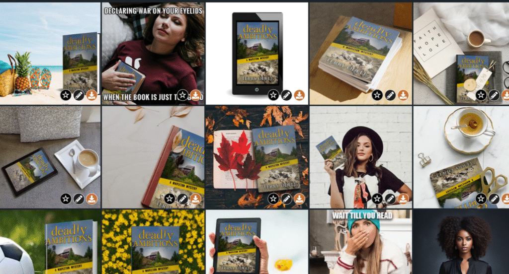 I’ve found two resources that have helped me: Mockup Shots and Canva. (I do have paid accounts at both.) I know a lot of authors use Brush instead of Canva, but I found it too limiting since I create images for a lot more than book promo (like for my blog, newsletter, and TKZ).