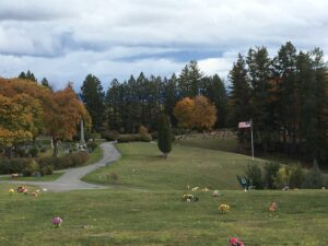 Founded in 1903, Conrad Cemetery is the final resting place for early settlers in the Flathead Valley and continues to serve the area to the present day. It is listed in the National Register of Historic Places. Greek Revival-style monuments rest on 104 acres of rolling hillsides that overlook the city of Kalispell. Orange lichen adds patina to granite and marble headstones from the early 1900s.