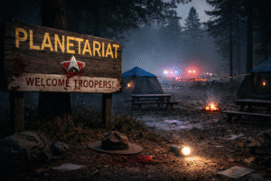 Here are story-related caption options for an image titled “Mysterious campsite at twilight”, all tuned to Scorched Earth–style tension. I’ve grouped them by vibe so you can pick what fits the post or rotate them.